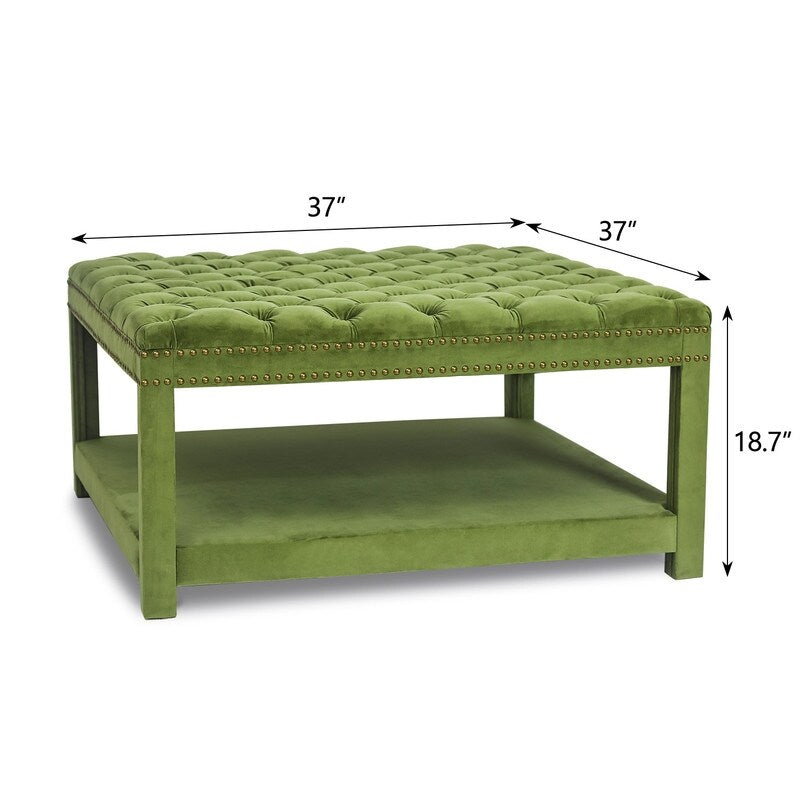 Add a touch of luxury to your living room with this Adeco Large Square Velvet Ottoman Coffee Table Footstool Footrest. Upholstered in soft and high-grade dark blue velvet, this ottoman features an eye-catching button tufted decoration that adds a luxurious look to your space. The contemporary design is further enhanced by the elegant nail-head trim along the edge. With a top surface that supports up to 300 Ibs. and a lower storage shelf that supports up to 75 Ibs., this large-sized ottoman measuring 37"D x 37"W x 18.7"H is perfect for use as a cocktail ottoman or additional living room seating. And, it's easy to assemble with all hardware and instructions included.