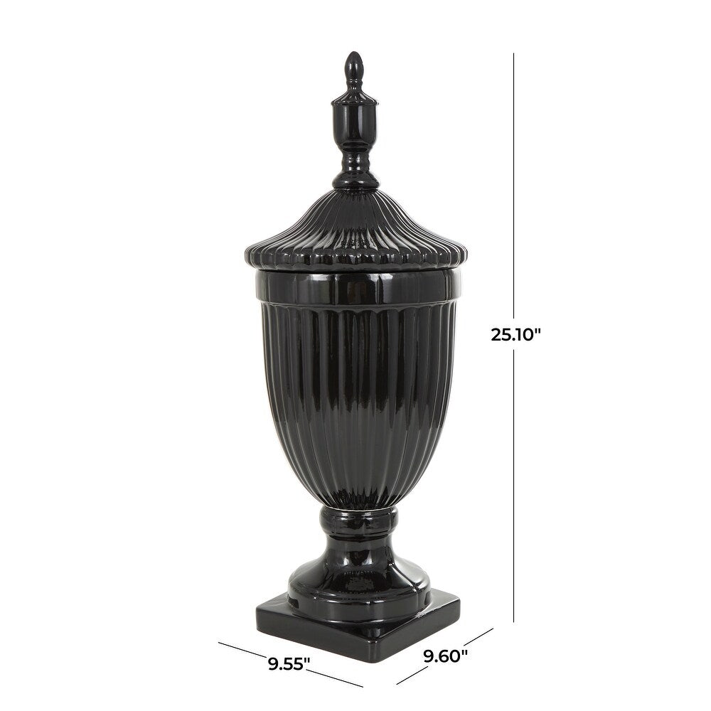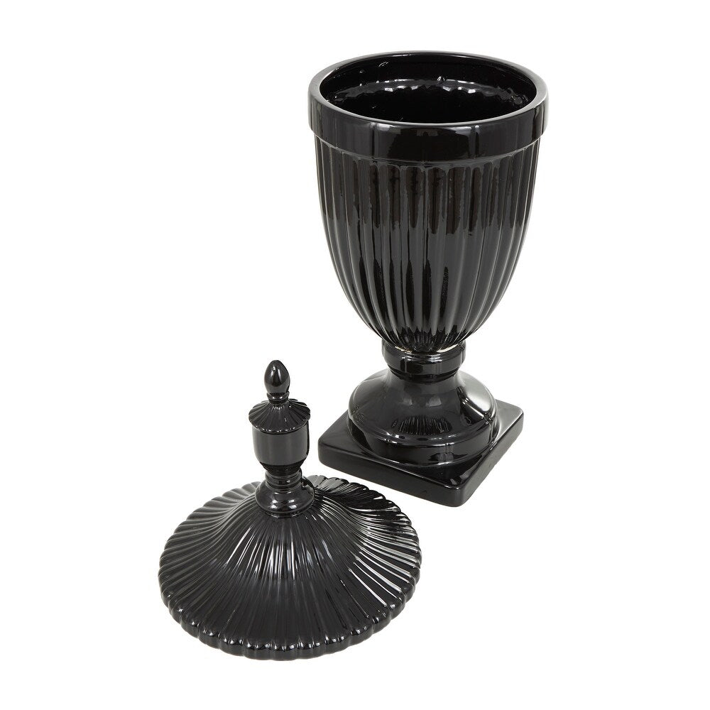 - Large urn and lid with a glossy black finish, finial top, textural vertical ridges, decorative block base