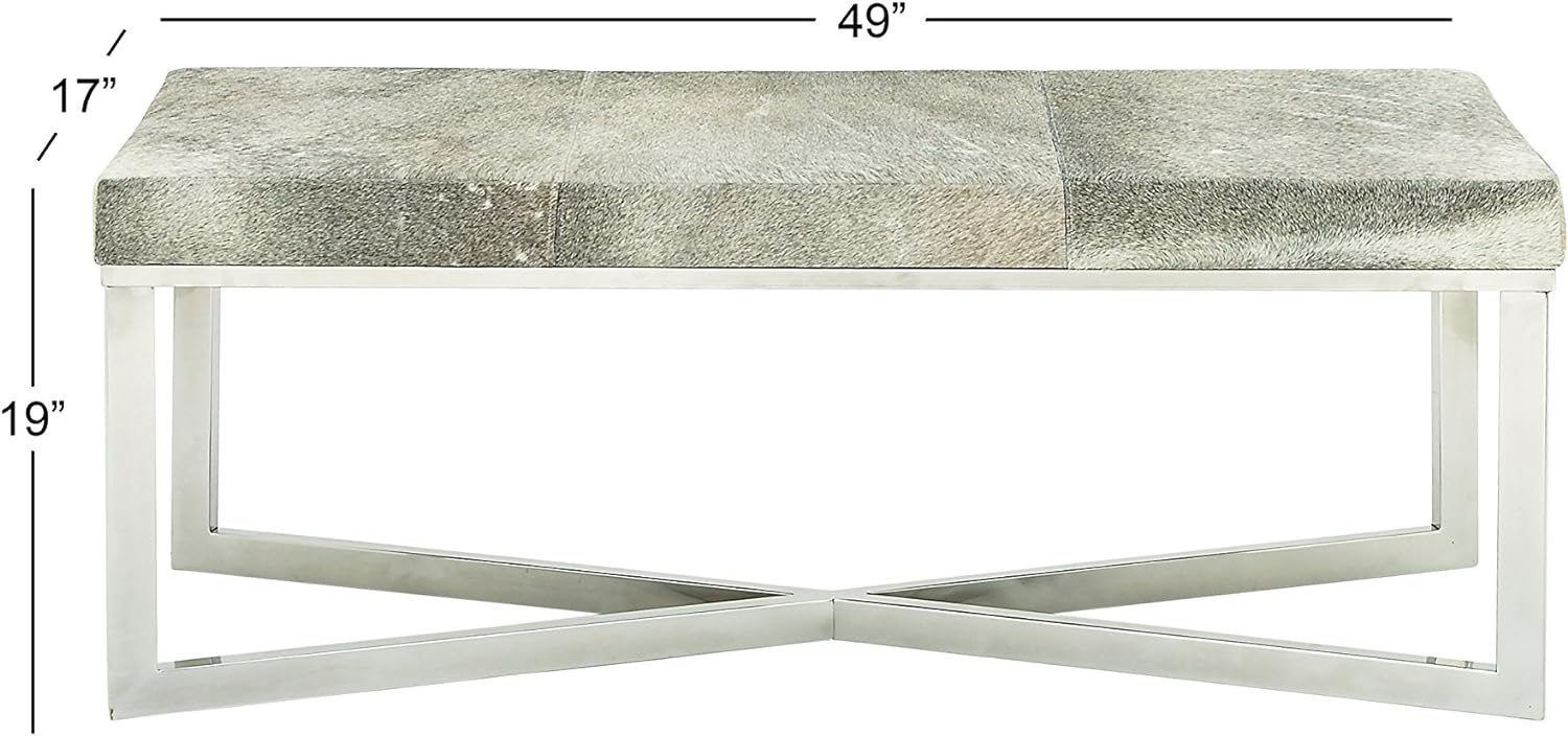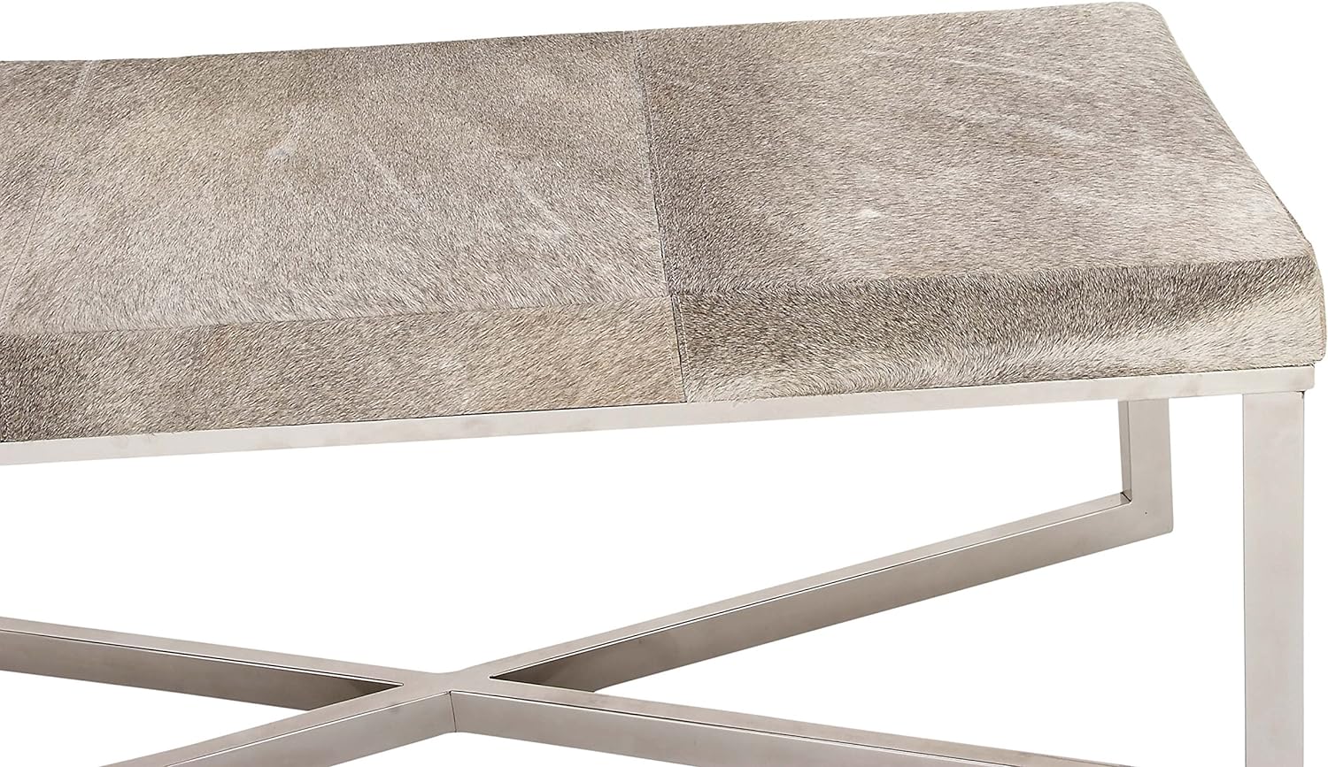 Gray Leather Handmade Cowhide Bench with Silver Metal Base - 49 x 17 x 19