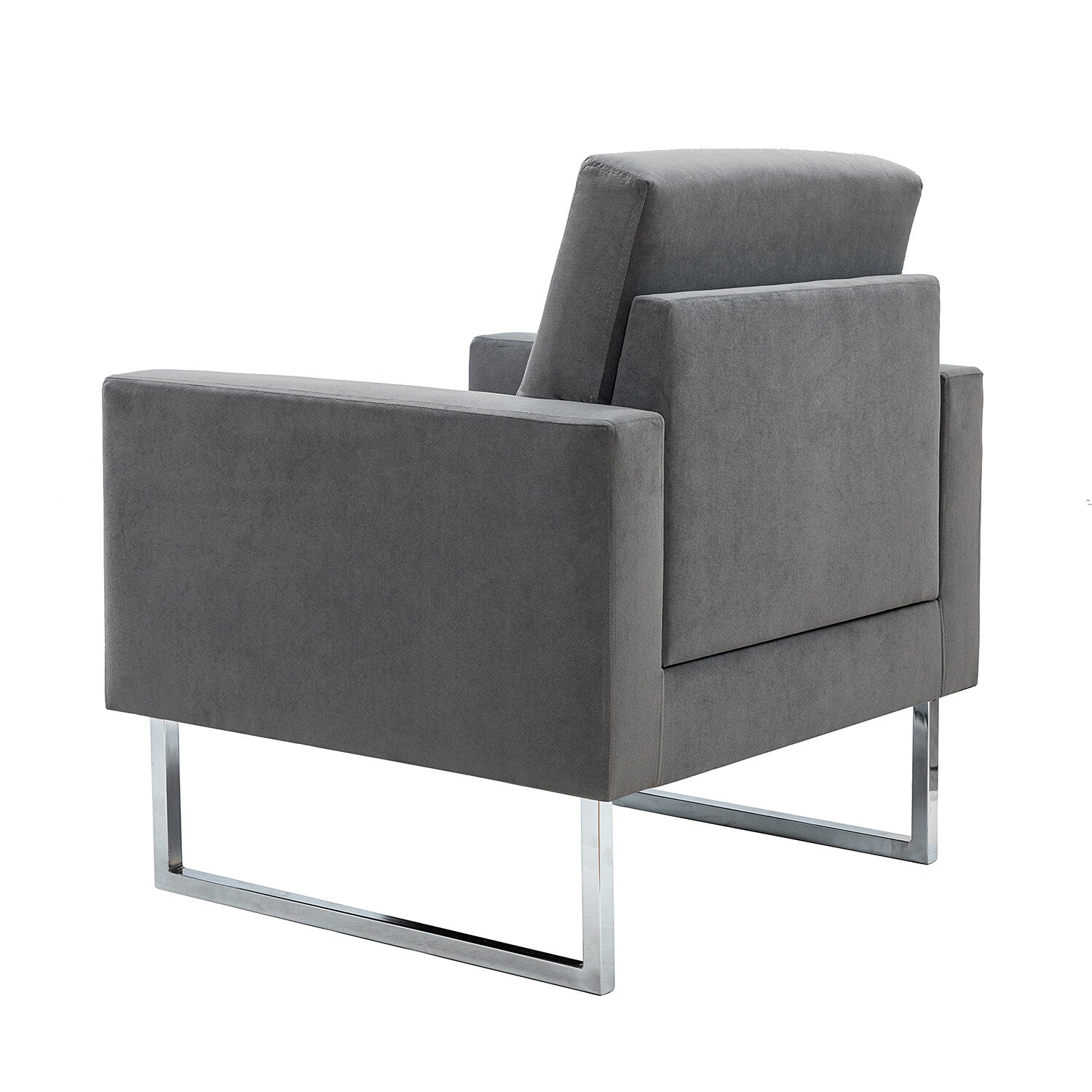The perfect contemporary-look piece to complement your home decor with its vivid color palettes, this attractive manufactured wooden frame club chair has it all: style, comfort, and durability. With a silver metal sled base, this modern work of art boasts a charming boxy silhouette and showcases an approachable aesthetic while the tufted design adds a touch of elegance to it. This strong structure is covered with skin-touch-friendly velvet fabric and filled with thick foam for ultimate comfort, suitable for all kinds of living room decoration. Incorporating the modern style effortlessly in a gentle appeal, this accent club chair with attention paid details brings unforgettable enjoyment as you curl up with a cup of chamomile or relax with your latest read. If you are looking for a beautiful and comfortable accent chair, look no further, this chair will be a great choice for you.