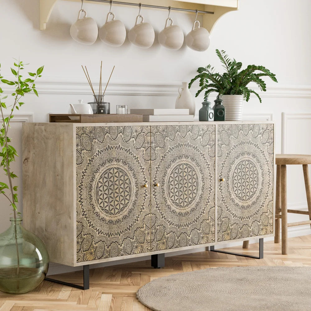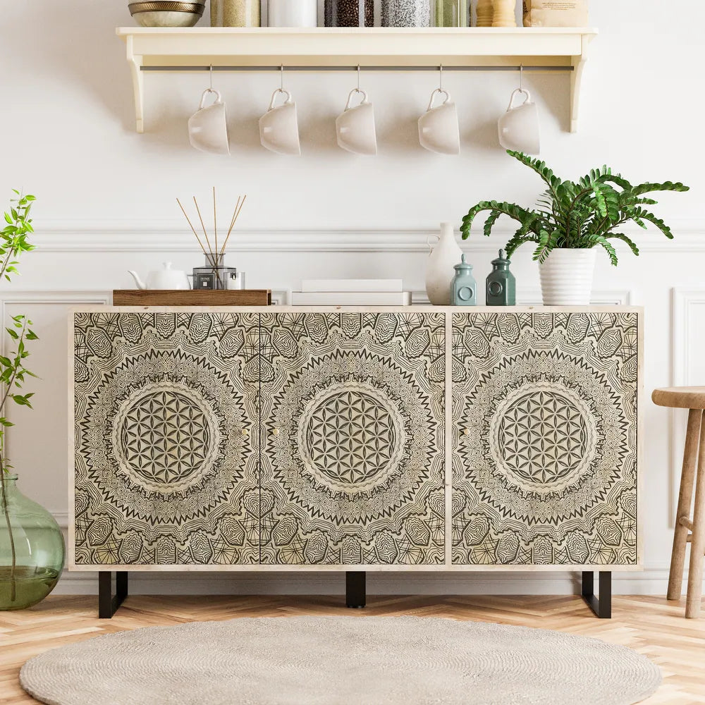 Give your dining room an artistic look with the DENHOUR BASIC Wood 55in Buffet with Screen Printed Pattern. The boho-style sideboard is a unique design, offering plenty of storage for hosting parties.