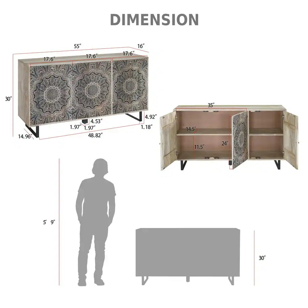 Solid Wood 55" Storage Credenza Entryway Accent Cabinet by Denhour