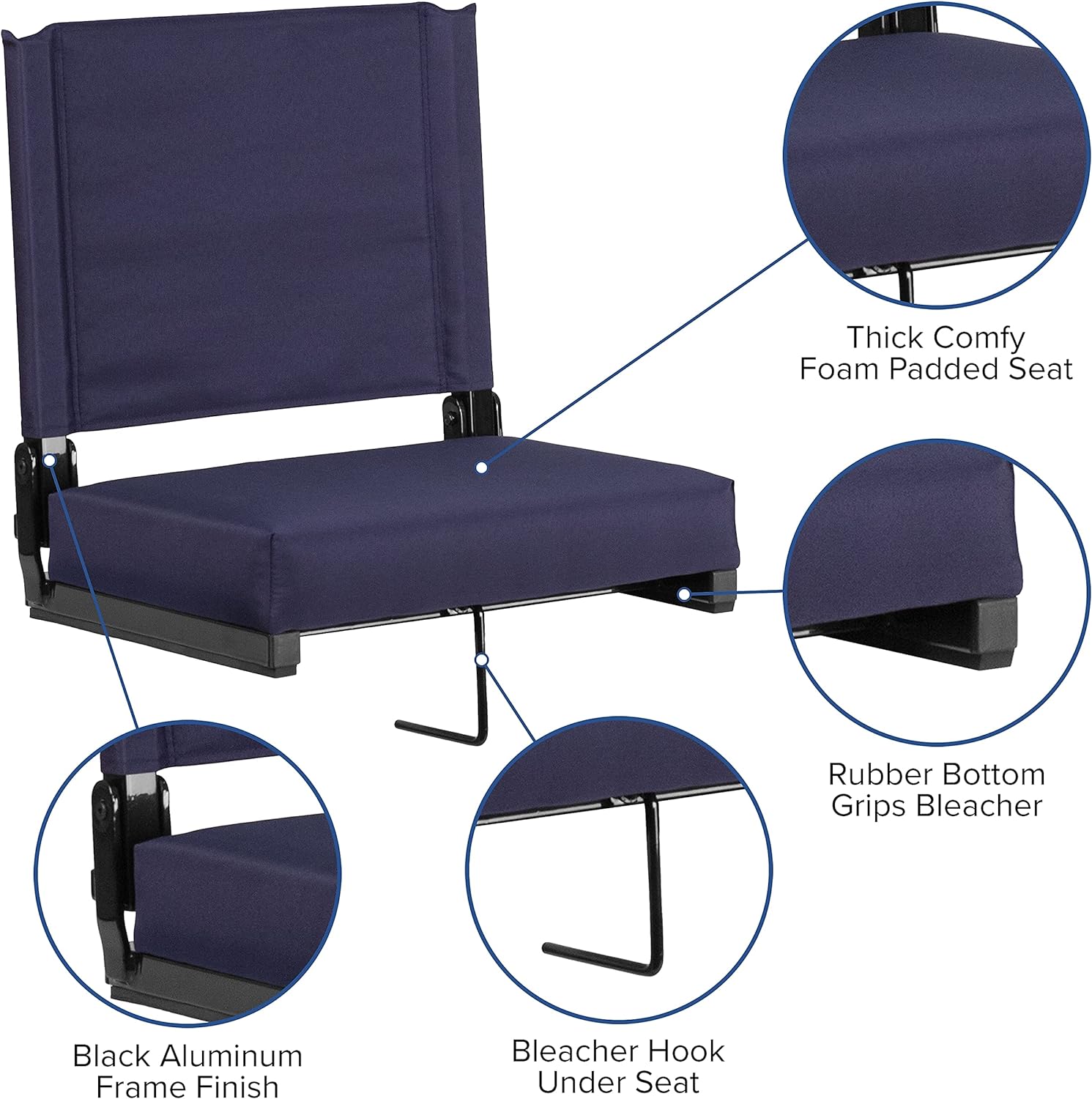 - COMFORTABLE PADDING: 3" thick padded seat and padded back provide optimal comfort even during long sporting events or concerts and supports up to 500 lbs.